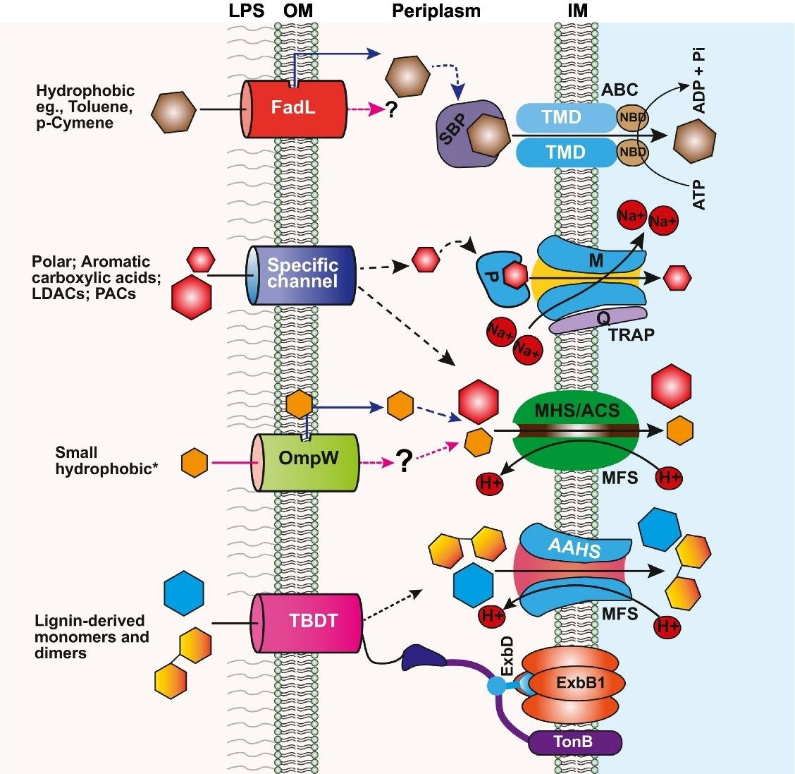 近年来,受益于蛋白晶体结构解析技术、计算生物物理学、多组学技术、生物信息学和合成生物学所带来的技术革命,芳香化合物的跨膜运输机制日益清晰。基于转运蛋白工程改造微生物对于木质素生物转化为高值芳香化合物、土壤和水体的生态修复、塑料的回收利用、生物传感器的开发和生物材料的合成等领域的发展具有重要意义。